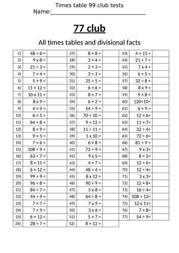Times Table 99 Club Tests Assessment Tool Teaching Resources